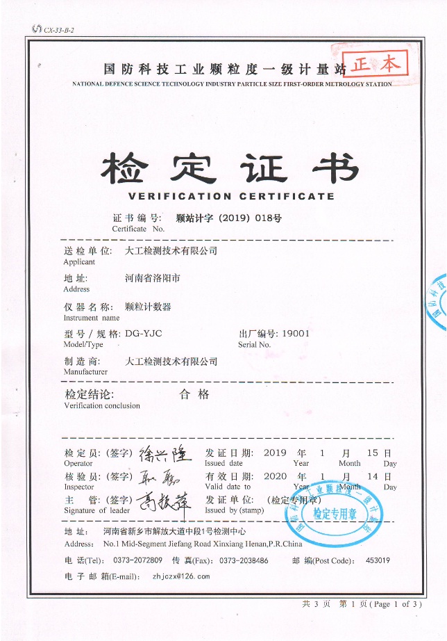 2019年1月15日,我公司研發生產的顆粒計數器,順利通過“國防科技工業顆粒度一級計量站”檢定,檢定結果合格。標志著我公司生產的顆粒計數器已具備實驗室顆粒度檢測精度要求!